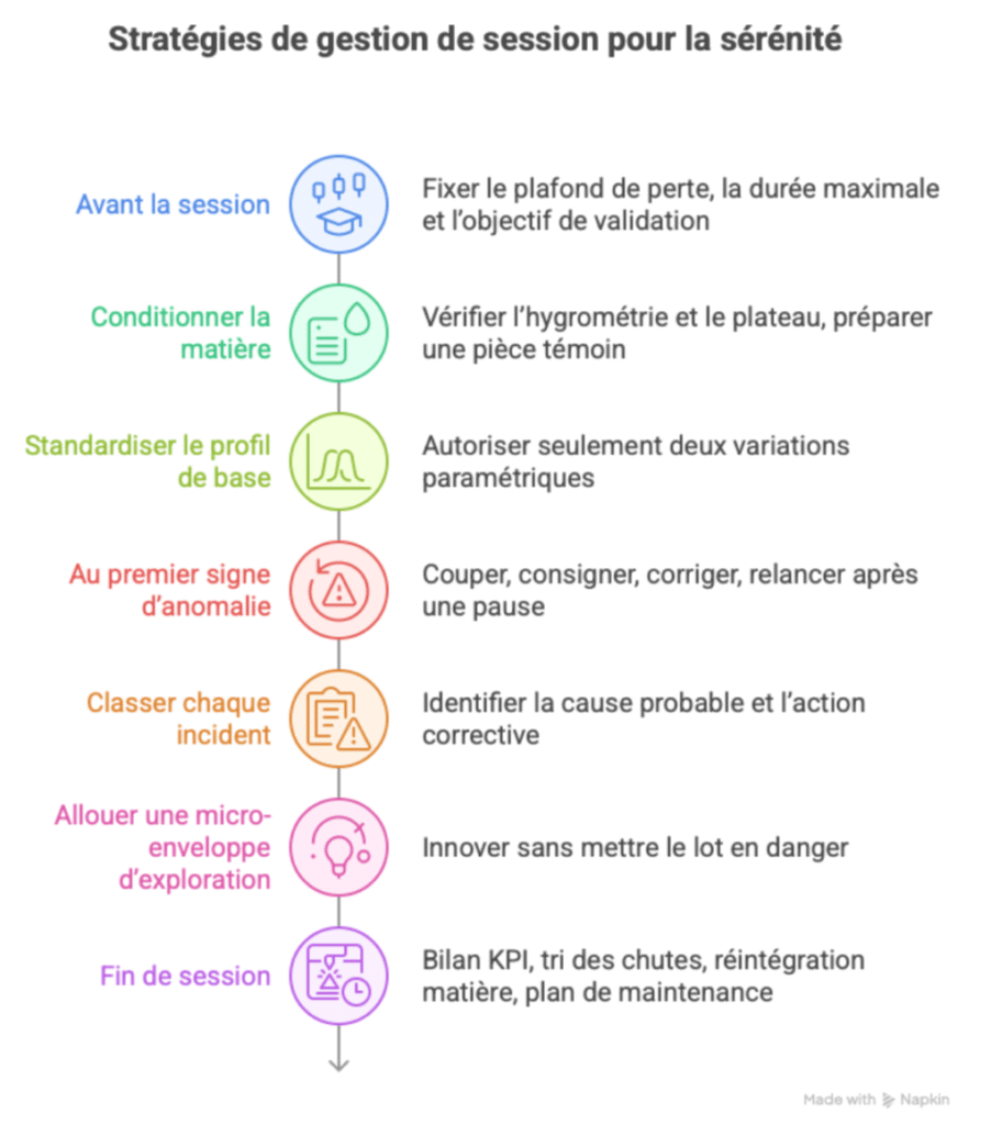 - Fin de session : bilan KPI sobre, tri des chutes, réintégration matière, plan de maintenance court.